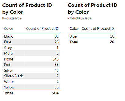 We then can visualize this new table and compare the row count to the count of ProductID by color of the original table. Comparing these two tables we see that ProductBlue is a subset of the Product table.