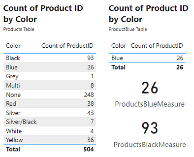 Creating the new ProductBlue table was for demonstrative purposes. The table returned by FILTER can be a virtual table used within a measure. In this case, the ProductBlue table would only persist while the measure is being evaluated. As an example, create a new ProductBlueMeasure measure using the COUNTROWS function. COUNTROWS takes a single argument, the table to count the row of. To do this we will pass the FILTER expression used to create the ProductBlue table to the COUNTROWS function. To further demonstrate that the ProductBlue table is unnecessary, we can create a similar ProductBlackMeasure by changing =”blue" to =”black". Viewing these measures shows the result is the same counts that were produced by the other methods used to obtain this count.