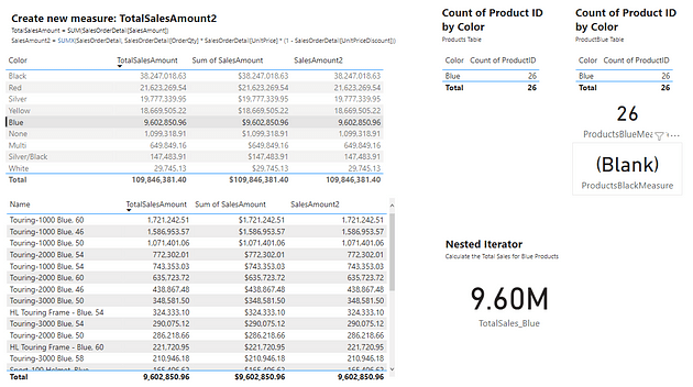 Viewing the two tables on the left, the totals sales for the Blue products for all methods is approximately 9.60M. Selecting the blue row in the top table filters the table below, to show sales by Product for only blue products. Viewing the totals for all three methods also shows a value of approximately 9.60M. Lastly, viewing the value card under Nested Iterator shows that the above created DAX expressions results in the same value of 9.60M.