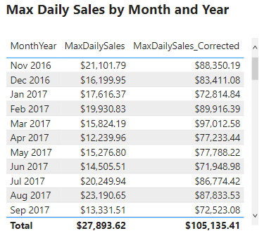 This table shows that the MaxDailySales for November 2016 is the same value as a single sale that occurred on November 17th. Yet, there are multiple sales on this day and every other day. The desired outcome is to calculate the total sales for each day and then determined the highest daily total value for each month.