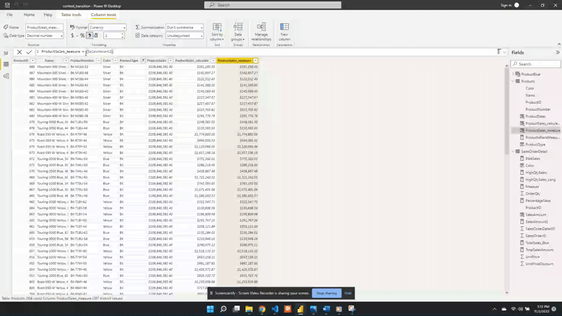 This new calculated column shows the correct sales value for each product. We view the product type BK and can see now each row in the ProductSales_calculate column is different for each row.