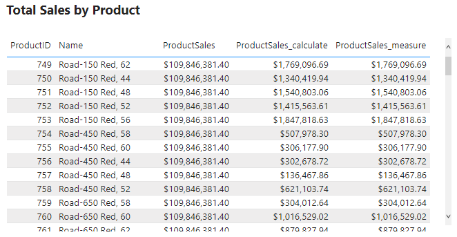 We add the new column to the table visual and can see that it has the same value as ProductSales_calculate. This shows that a measure defined with an iterator also forces context transition.