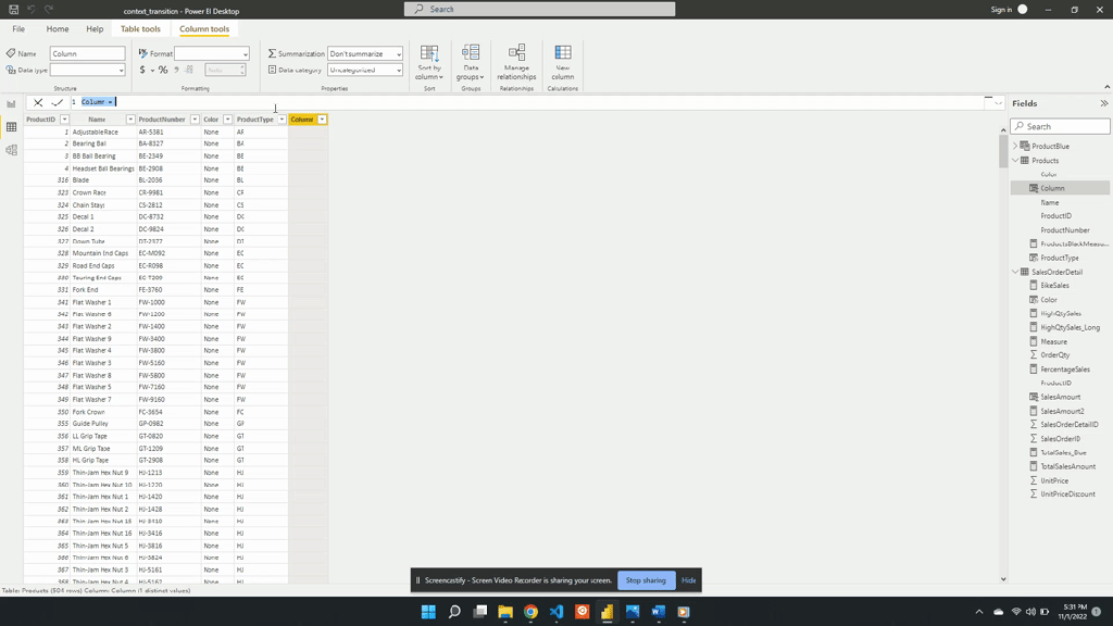The concept of context transition can be a bit abstract so it can be easiest to learn through examples. To explore, we will create a new calculated column in the Products table. The new ProductsSales calculates the total sales for each product and we define it as:
