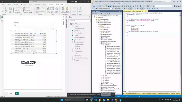Below is an example the limitation noted above. Here, we have the same Power BI report on the right as the example above and the SQL database on the left. We will start by executing the query which adds a new ManagerID column to the Product table, sets the value as a random number between 0 and 100, and then selects the top 100 products to view the update.