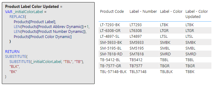 Now we are starting to see the true power of DAX Text Functions, this expression does so much more than just a singular adjustment: it first reshapes the product label and then it goes even further to make sure the abbreviation and color codes that make up the label are consistent and concise. It is an illustration of how DAX can incrementally build and refine results for more accurate and streamlined outputs.