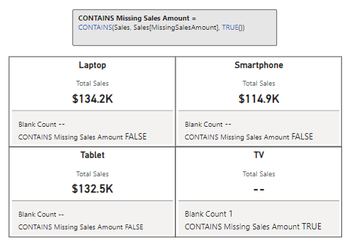 Now, if we are interested in knowing just if there are missing sales amounts, we could update this expression to return true if COUNTROWS returns a value greater than 0, however this is where we can use CONTAINS to create a more effective measure.