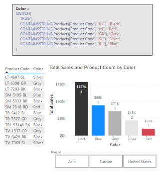 We can use CONTAINSSTRING to dissect our Product Code and enrich our dataset by adding a calculated column containing a user-friendly color value of the product. Here is how.