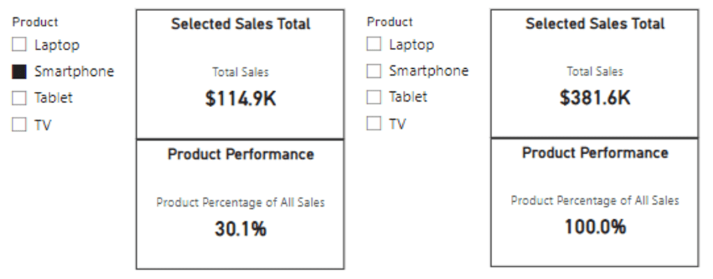 We start to see the difference in these functions when we start to incorporate other slicers, such as our region slicer. In the middle image, we can see if no product is selected our Product Performance card display “N/A”, because our Products[Product] column is not being directly filtered.