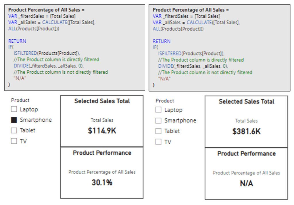 When our Sales table is only filtered by our Product slicer, we see that the ISFILTERED measure and the ISCROSSFILTERED measure return the same value (below on the left). This is because as before the column Products[Product] is directly filtered by our Product slicer, so the ISFILTERED measure carries out the calculation and returns the percentage.