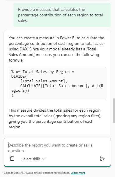 Let’s look at how Copilot handles a different kind of problem: calculating how much a specific segment contributes to the overall total. In this case, we want to understand how much each region contributes to total sales.