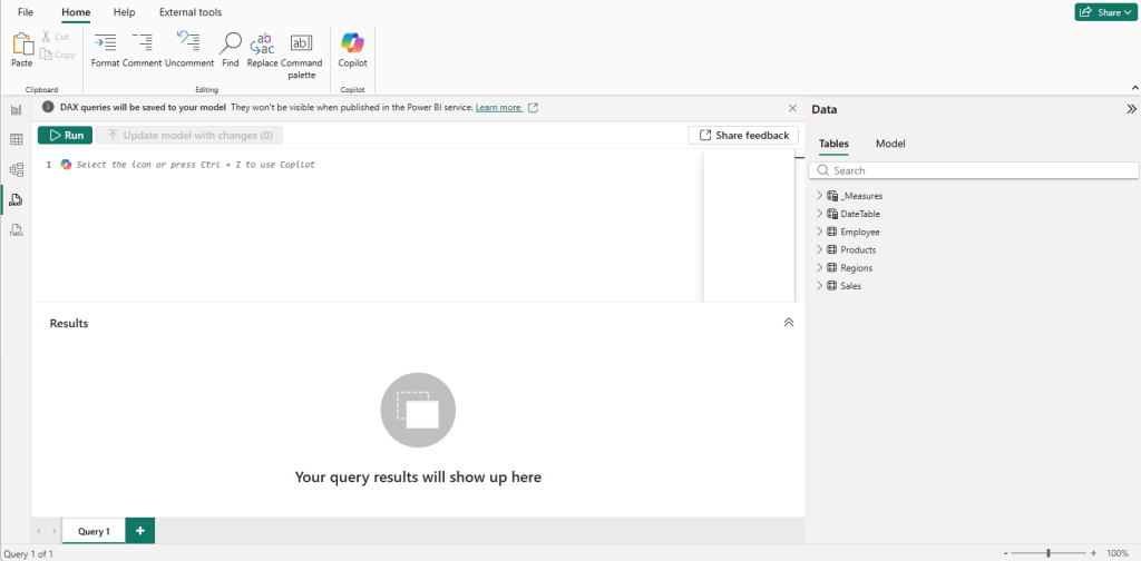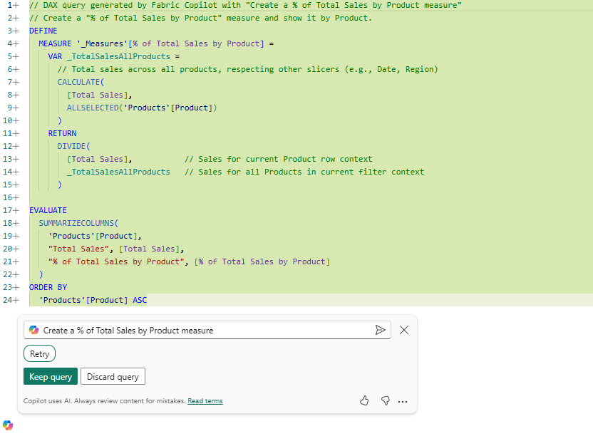 The DAX query view has its own separate inline Copilot, distinct from the report view pane. It is particularly useful for writing DAX queries, understanding existing measures, and learning DAX concepts in context.