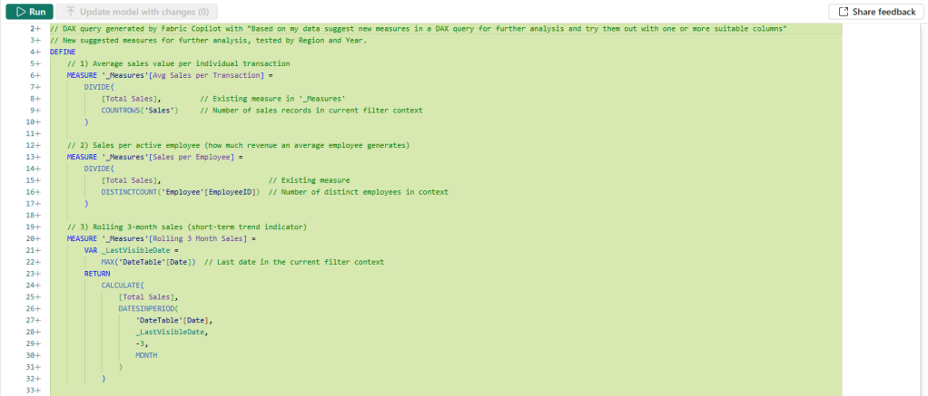 The DAX query view inline Copilot adds further value. The Suggest measures feature returned six well-structured analytical measures in a single prompt, complete with inline comments and a live preview. The Add comments workflow produced useful documentation rather than just variable name restatements. These are the features that make the biggest difference in team environments where maintainability matters.