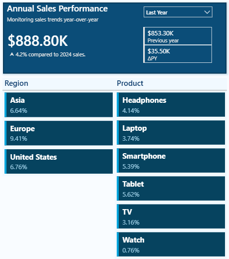For example, when users apply a Year slicer to focus on the previous year, the numerator correctly reflects only the previous year’s sales, but the denominator still reflects all years.