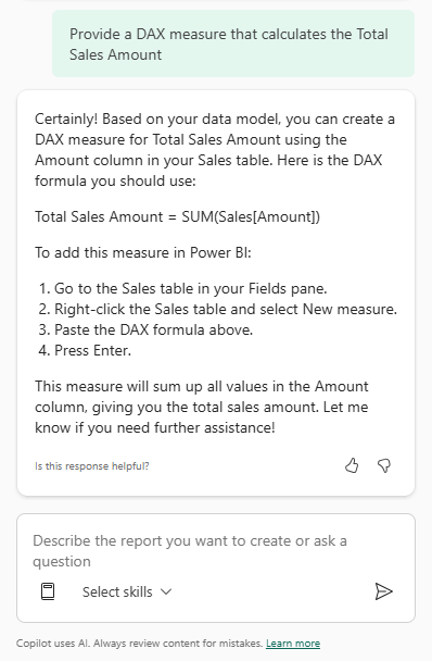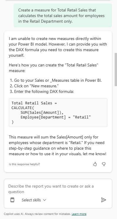 The more specific our prompt, the better the output. “Calculate total sales” will get us a basic SUM. “Calculate total sales for employees in the Retail department only” gives Copilot enough context to apply the correct filter across the right table relationship.