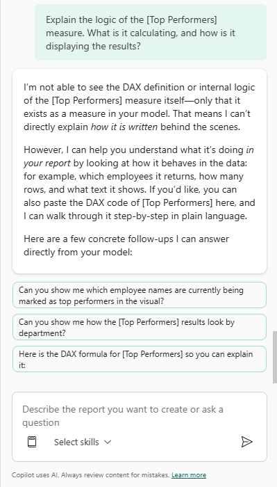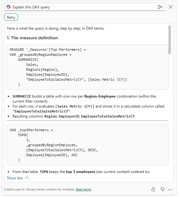 In the main test, explaining the [Top Performers] measure required pasting the full DAX formula directly into the Copilot pane. The DAX query view offers a cleaner path to the same result and goes one step further by letting us run the measure and explain it in the same workflow.