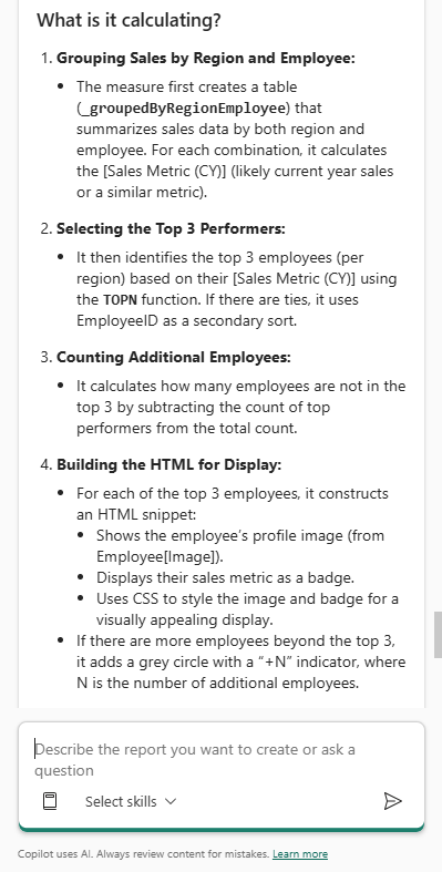 The explanation scenario highlighted something equally valuable. Feed Copilot a complex, multi-variable measure with HTML rendering logic and it will walk through it step by step in plain language. For onboarding new team members, auditing inherited models, or simply revisiting logic written months ago, that capability is genuinely useful.