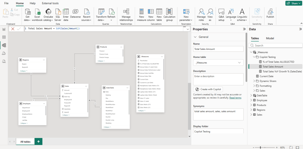 For this test, we want to create a dynamic % of Total Sales measure that displays correctly across multiple dimensions — Products, Regions, and Departments — while also respecting report-level filters like Year. Here is the measure as it currently exists in the model: