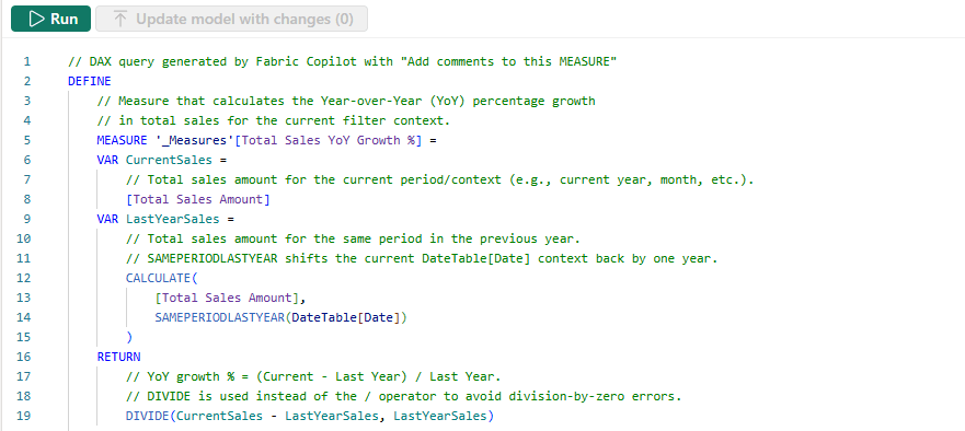 This is the right behavior. The comments that travel with the measure when we select Update model with changes are the ones inside the DEFINE MEASURE block. Copilot correctly focused its documentation effort where it counts.