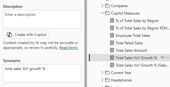 For this test, we navigate to Power BI Desktop’s Model view, select the Total Sales YoY Growth % measure, and use the Create with Copilot option in the Properties pane.
