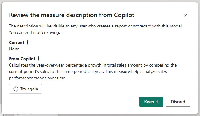 Note: Copilot will only generate descriptions for measures in a valid state with no errors. Resolve any measure issues before attempting to generate a description.